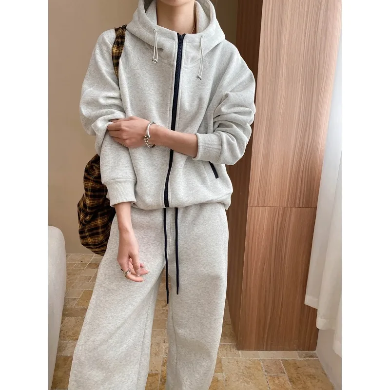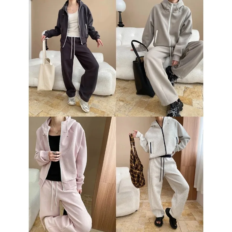 Spring Casual Stand Up Collar Hooded Sweatshirt Drawstring Elastic Sweat Pants Women Two-piece Set